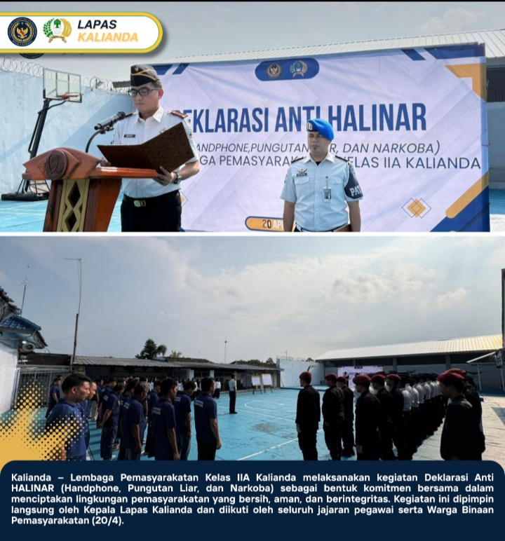 lampung Selatan – Lembaga Pemasyarakatan Kelas IIA Kalianda melaksanakan kegiatan Deklarasi Anti HALINAR (Handphone, Pungutan Liar, dan Narkoba) sebagai bentuk komitmen bersama dalam menciptakan lingkungan pemasyarakatan yang bersih, aman, dan berintegritas. Kegiatan ini dipimpin langsung oleh Kepala Lapas Kalianda dan diikuti oleh seluruh jajaran pegawai serta Warga Binaan Pemasyarakatan (20/4).